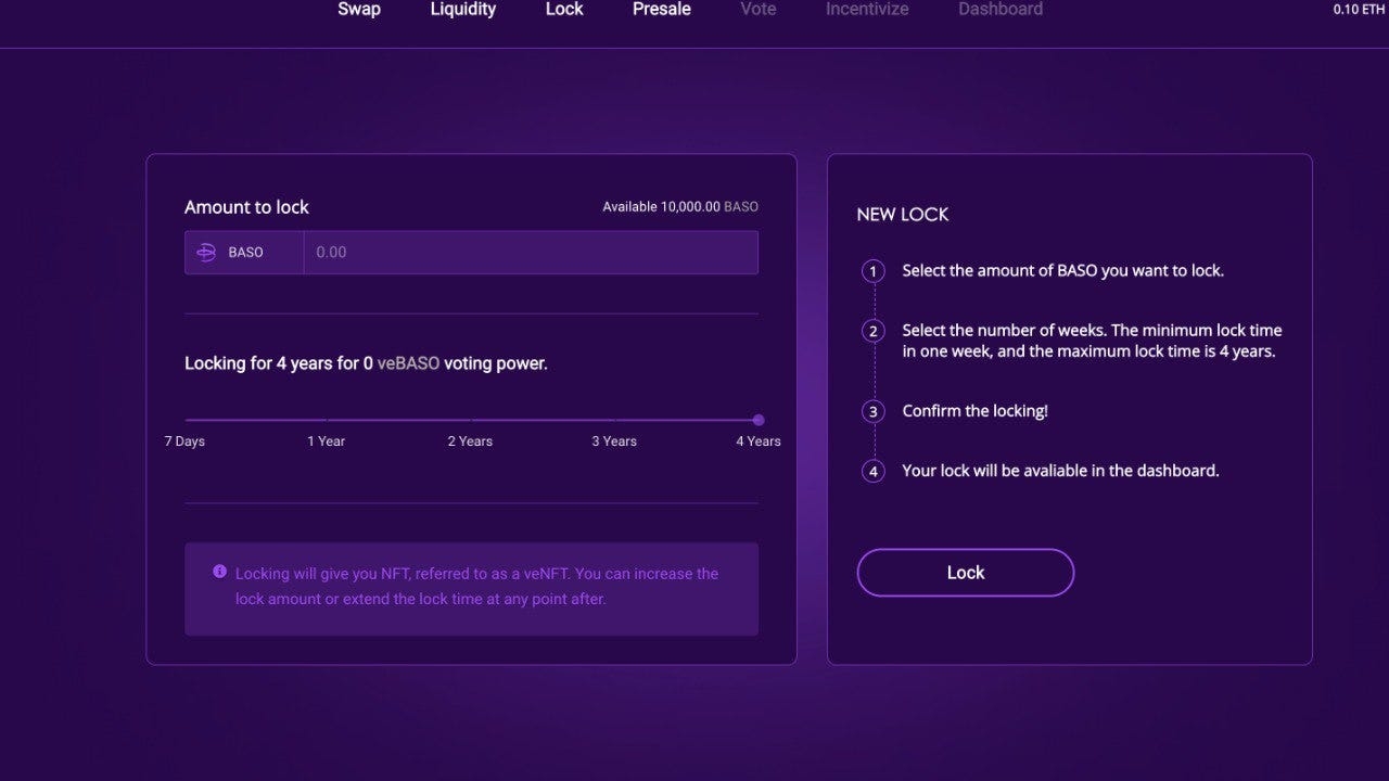 3. Users can go to the lock page to lock their $BASO into veBASO and then go to the vote page to vote.